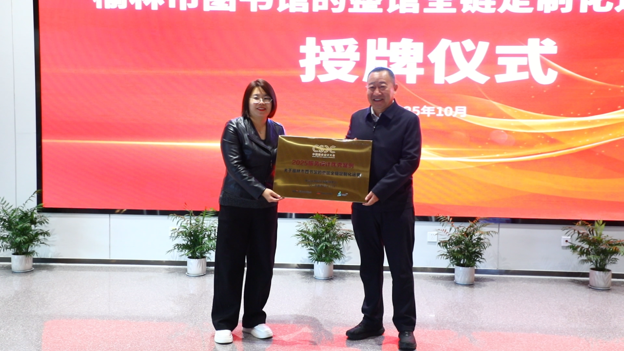 金秋时节,榆林市图书馆一楼东大厅气氛热烈,“2025中国服务设计优秀案例”的授牌仪式在此举行。中国服务设计大会组委会/北京光华设计发展基金会执行秘书长孙海珍,榆林市公共文化服务中心主任林茂绿、副主任乔泰山,武汉阅道文化科技有限公司执行总经理朱丛庆等出席,60余名代表共同见证这一荣誉的现场颁发。