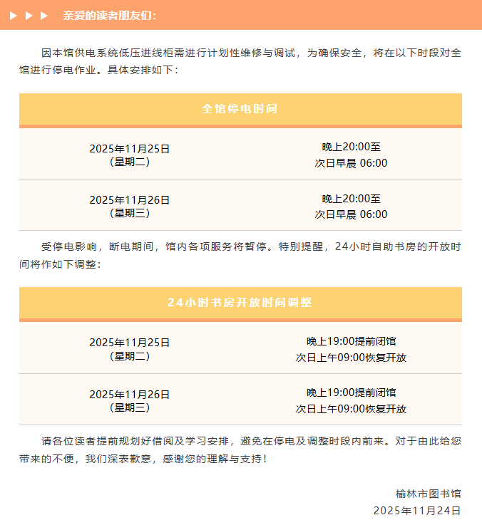 重要通知|榆林市图书馆停电检修安排!24小时城市书房开放时间调整