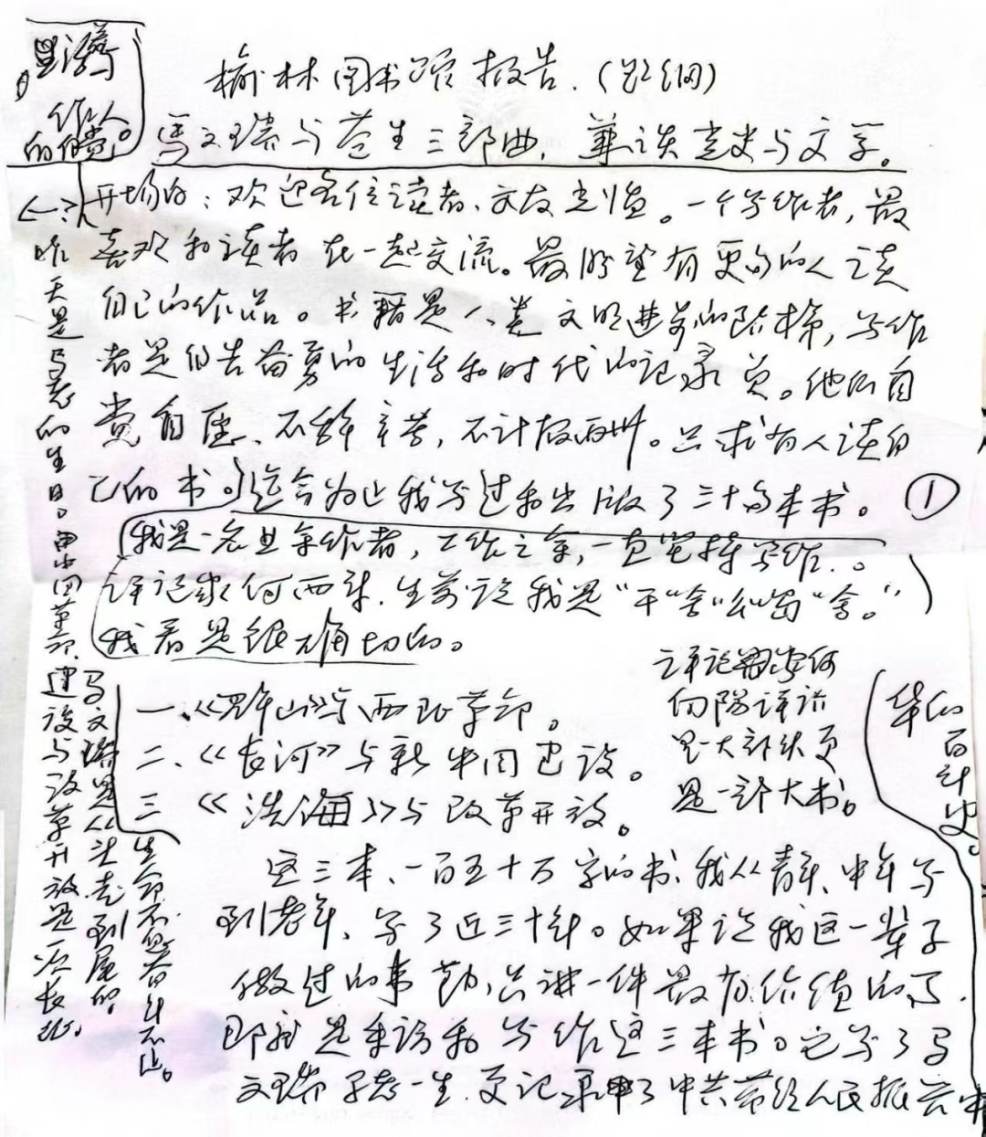 近期,国务院原参事、著名作家忽培元赴榆林,为榆林市图书馆完成第二次图书捐赠,带来个人精品著作19种30册,涵盖长篇小说、传记文学、散文诗集等多元品类,以书香助力地方文化建设。同期,他以“马文瑞与《苍生三部曲:群山、长河、浩海》”为题开讲公益讲座,课前手写的四页手稿字迹恳切,将对文学的敬畏、对读者的赤诚与创作初心,尽数藏于字里行间。