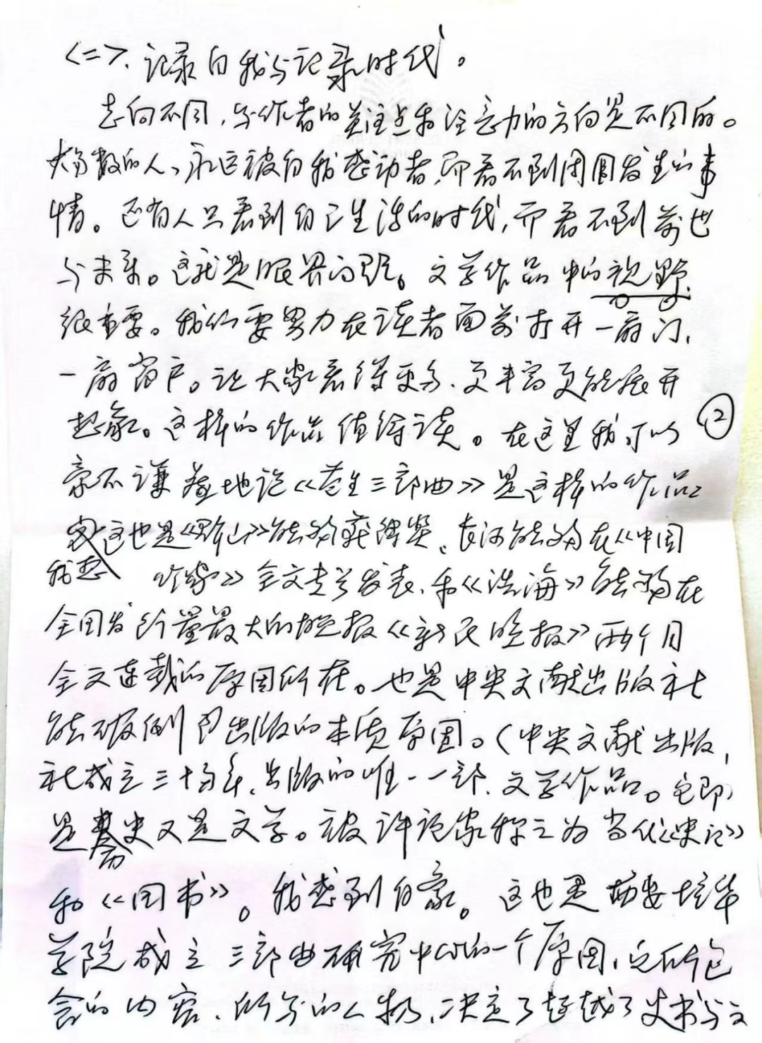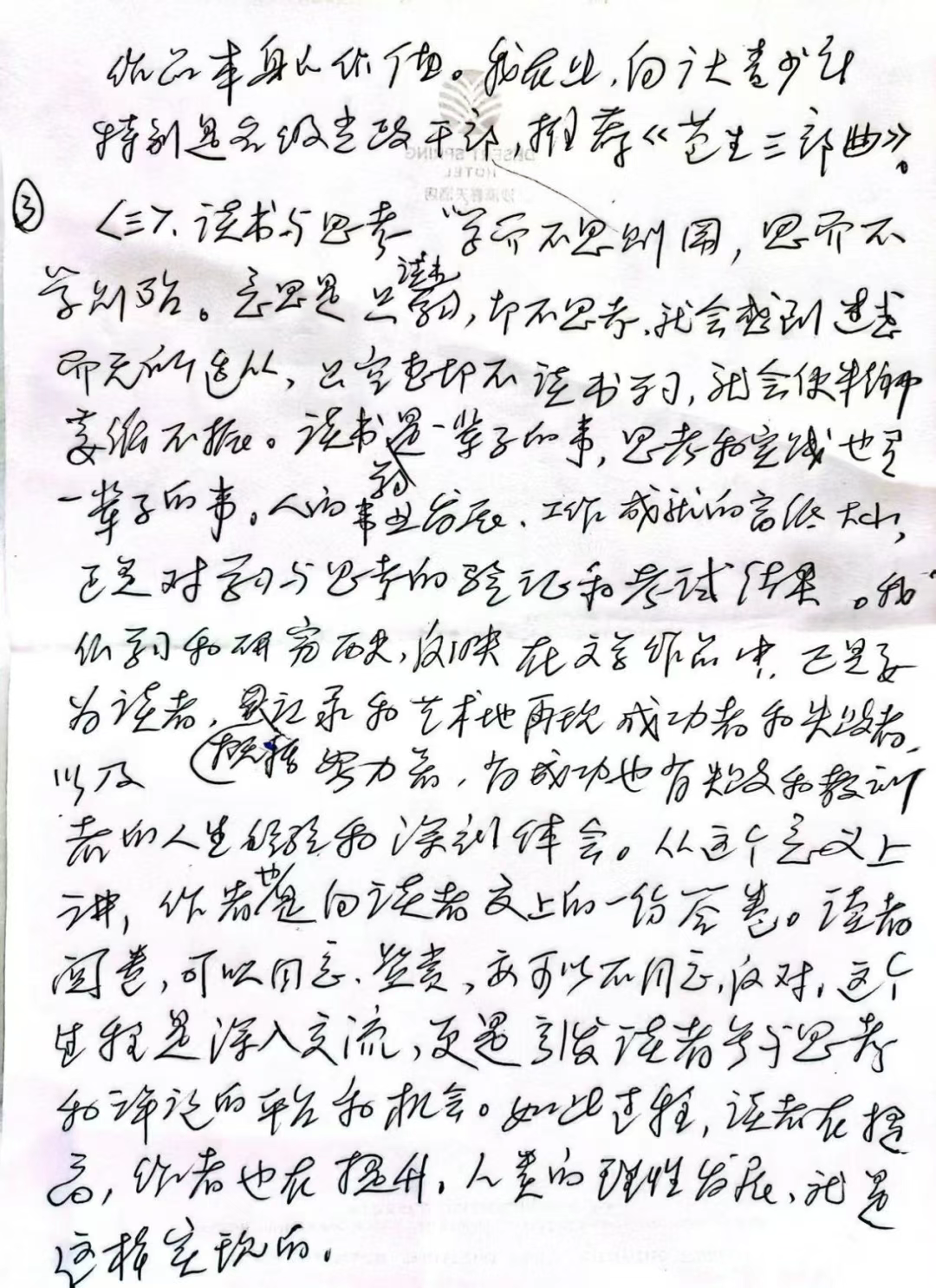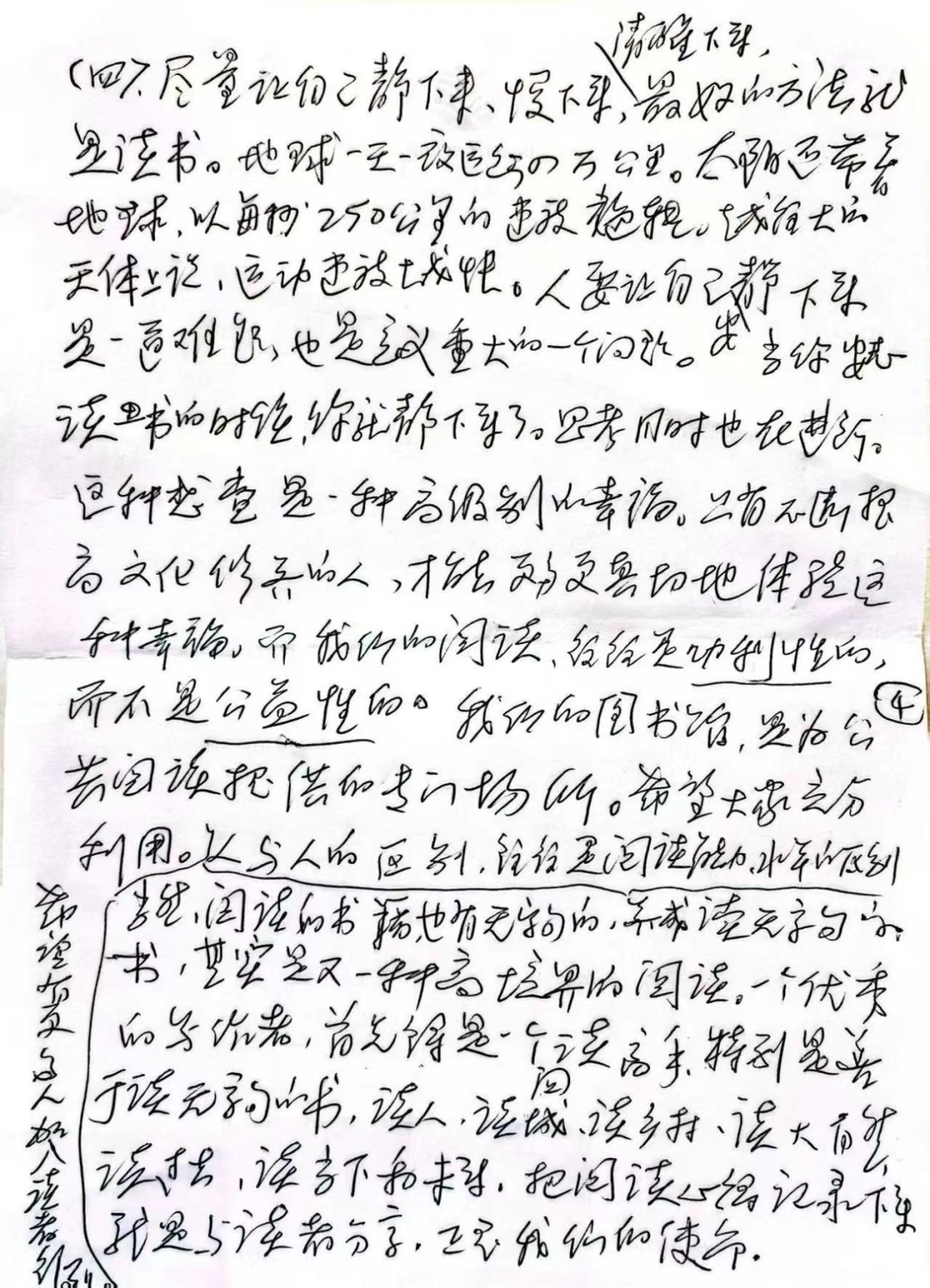 公益讲座现场,忽培元以四页手写手稿为脉络,娓娓道来创作故事与阅读感悟。手稿开篇便写下“一个写作者,最喜欢和读者在一起交流”,坦言三十余部作品皆源于“为读者写、为时代记”的朴素心愿,直言“书籍是人类文明进步的阶梯,写作者是生活和时代的记录者”;谈及《苍生三部曲》,手稿清晰记下这部作品的“三十年重量”——从构思到完稿耗时三十年,《长河》全文连载、《浩海》连续两月刊载于《新民晚报》,更成为中央文献出版社成立三十余年“首推的文学作品”,被评论家盛赞为“当代史记”;他还在稿中引用“学不思考则罔,思而不学则殆”,强调“读书是一辈子的事,思考和实践也是”,认为文学作品记录着“成功者、失败者的经验与教训”,读者的共鸣与思辨,是作家与读者的深度对话,更是人类理性的成长历程;稿末,他写下对阅读的期许:“最快让自己静下来的方法是读书”,称慢读书是“高格调的幸福”,呼吁读者在快节奏生活中守住阅读的精神滋养。