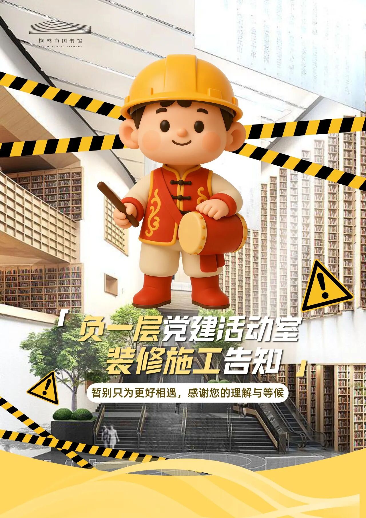 为完善场馆服务功能,提升阅读环境品质,榆林图书馆负一层党建活动室将于2026年1月5日(周一)至1月10日(周六)期间进行内部装修与布置施工。
