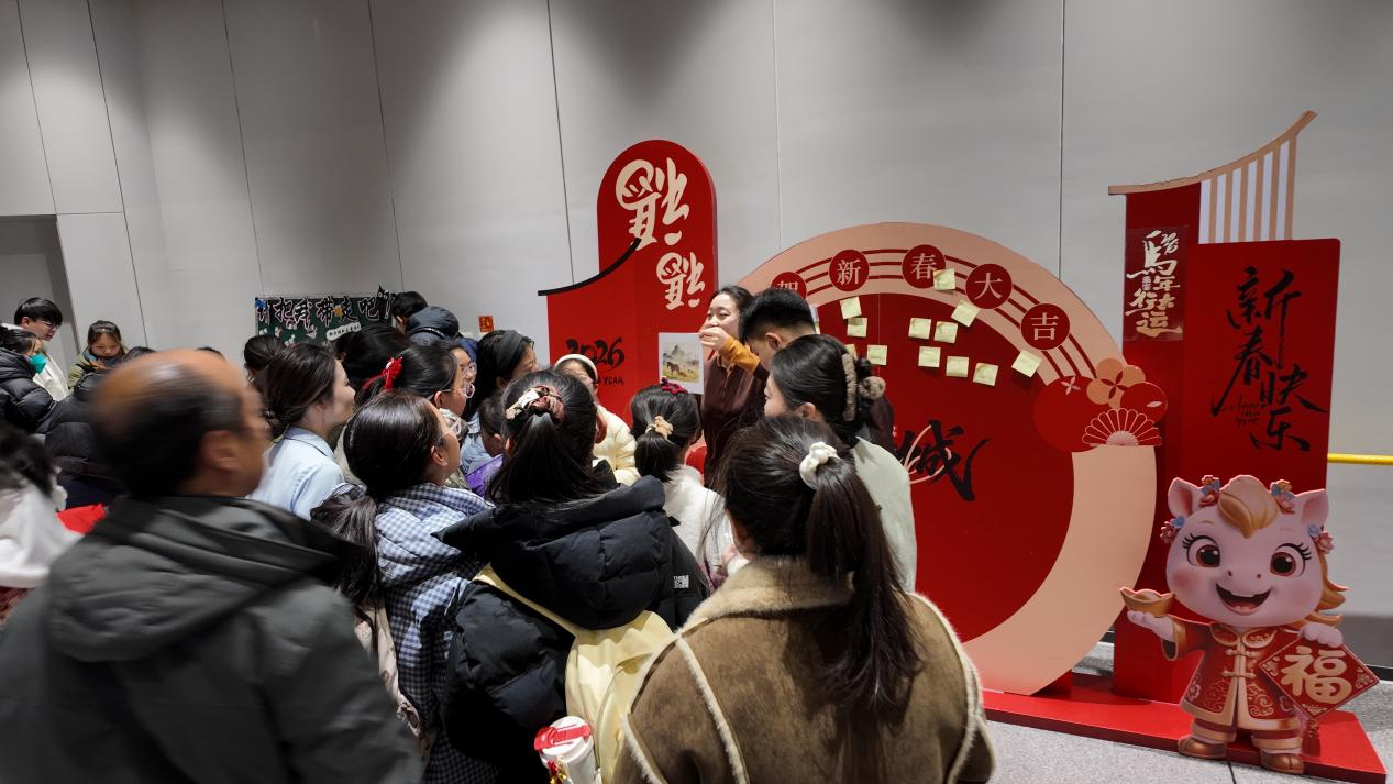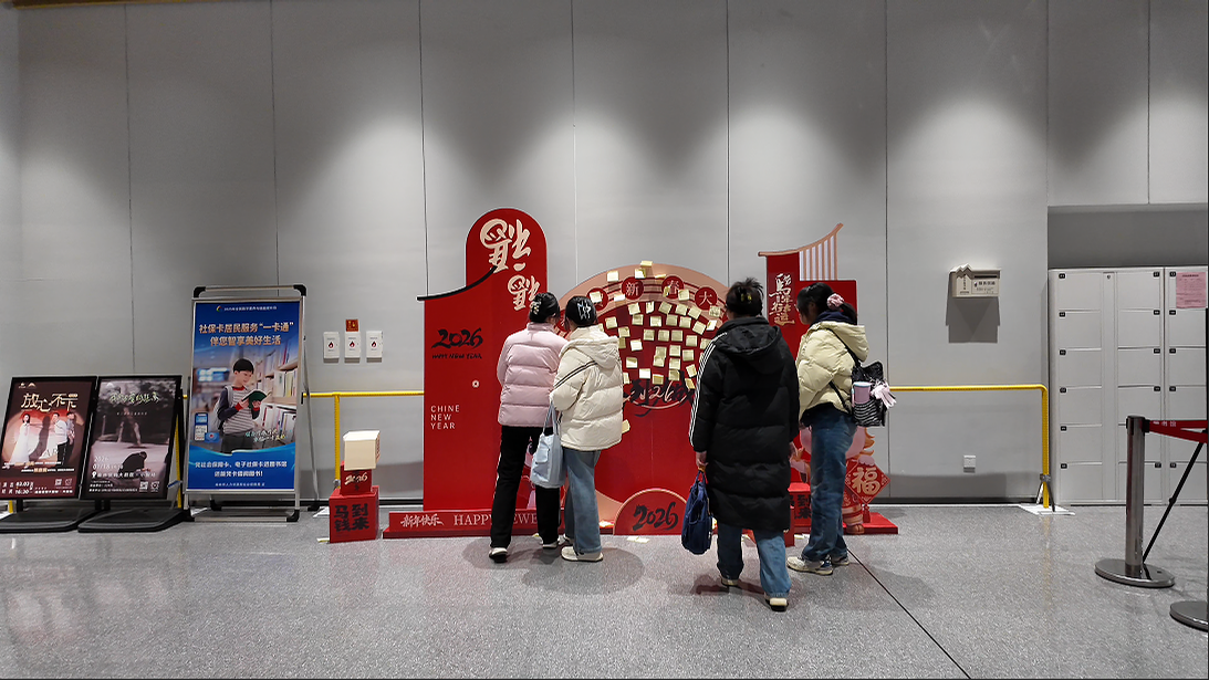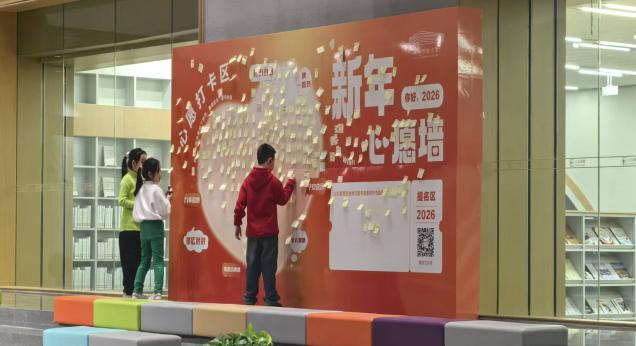 围绕辞旧迎新,打造了系列沉浸式场景。“辞旧迎新打卡站”与“2026,我想对你说”新年心愿墙活动,将图书馆空间转化为情感互动与新年期许的载体,吸引了大量读者尤其是年轻读者和家庭读者驻足参与、拍照留念、书写祝福,让书香空间充满了温馨的仪式感与人文温度。