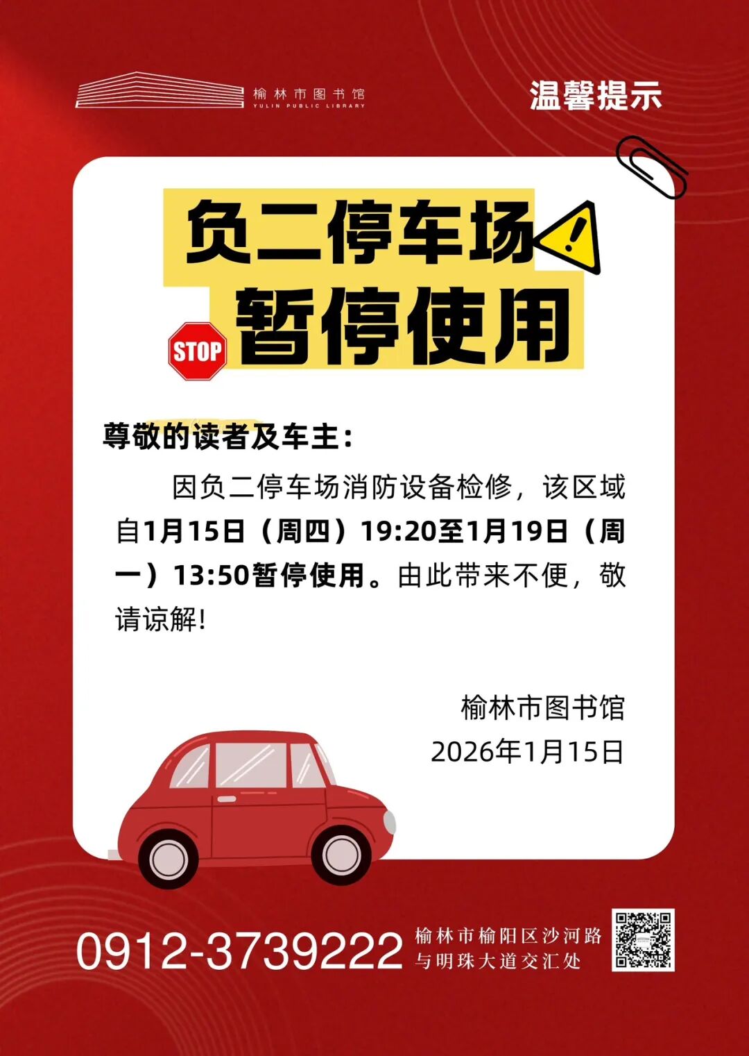 通知|榆林市图书馆负二停车场将暂停使用,车主请留意!