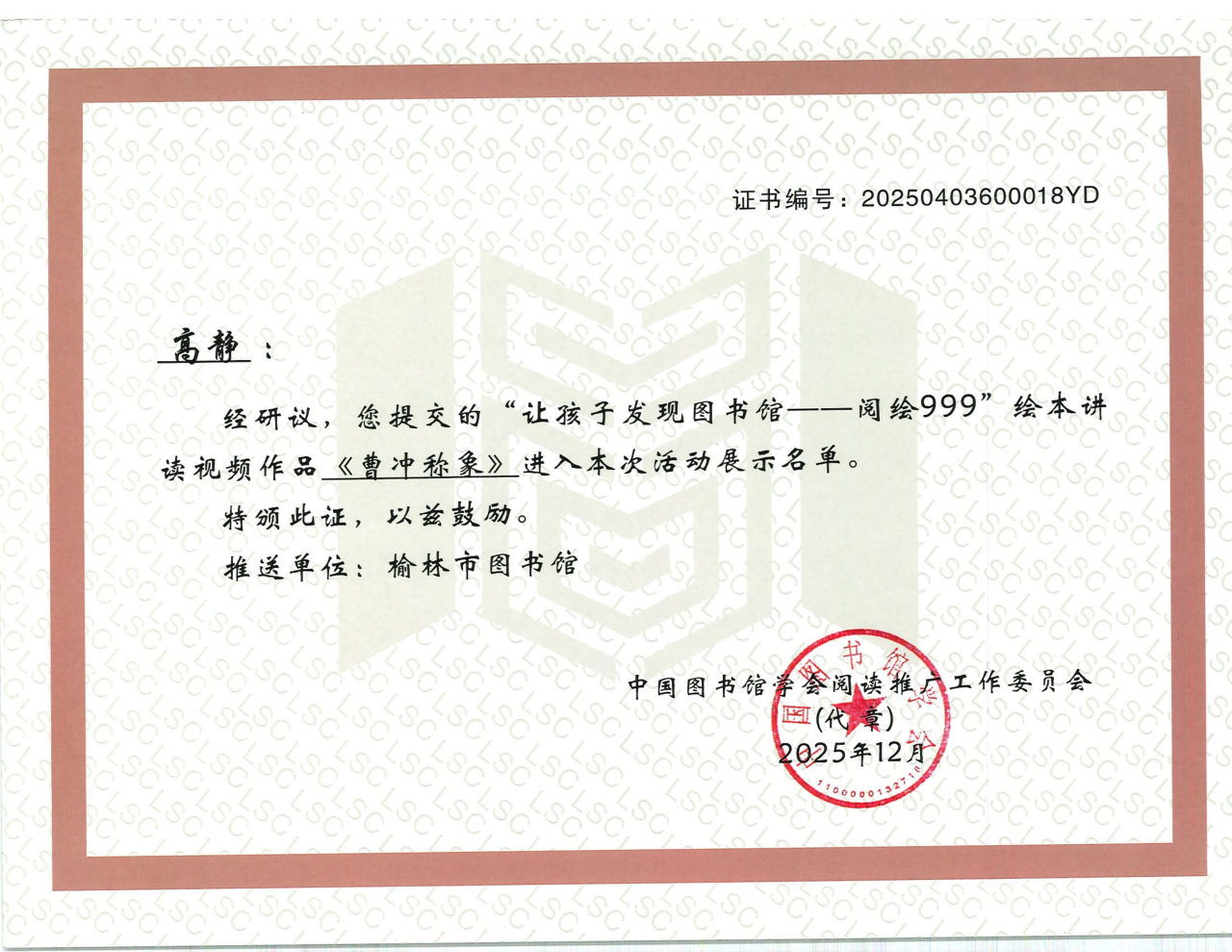 近日,由中国图书馆主办的 “让孩子发现图书馆 —— 学会阅读推广” 系列推广活动评选结果揭晓,榆林市图书馆作为参与单位,报送的视频作品《曹冲称象》成功入选全国展示名单。