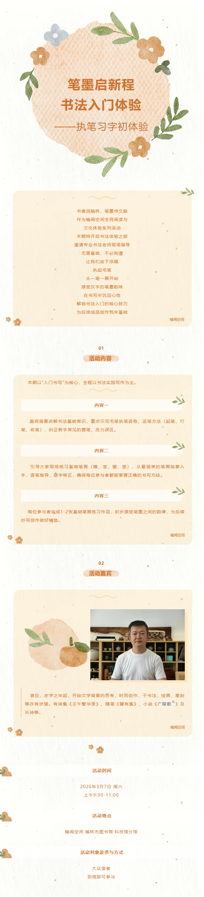 榆阅空间 榆林市图书馆·科技馆分馆 活动预告 | 笔墨启新程——书法入门体验·执笔习字初体验