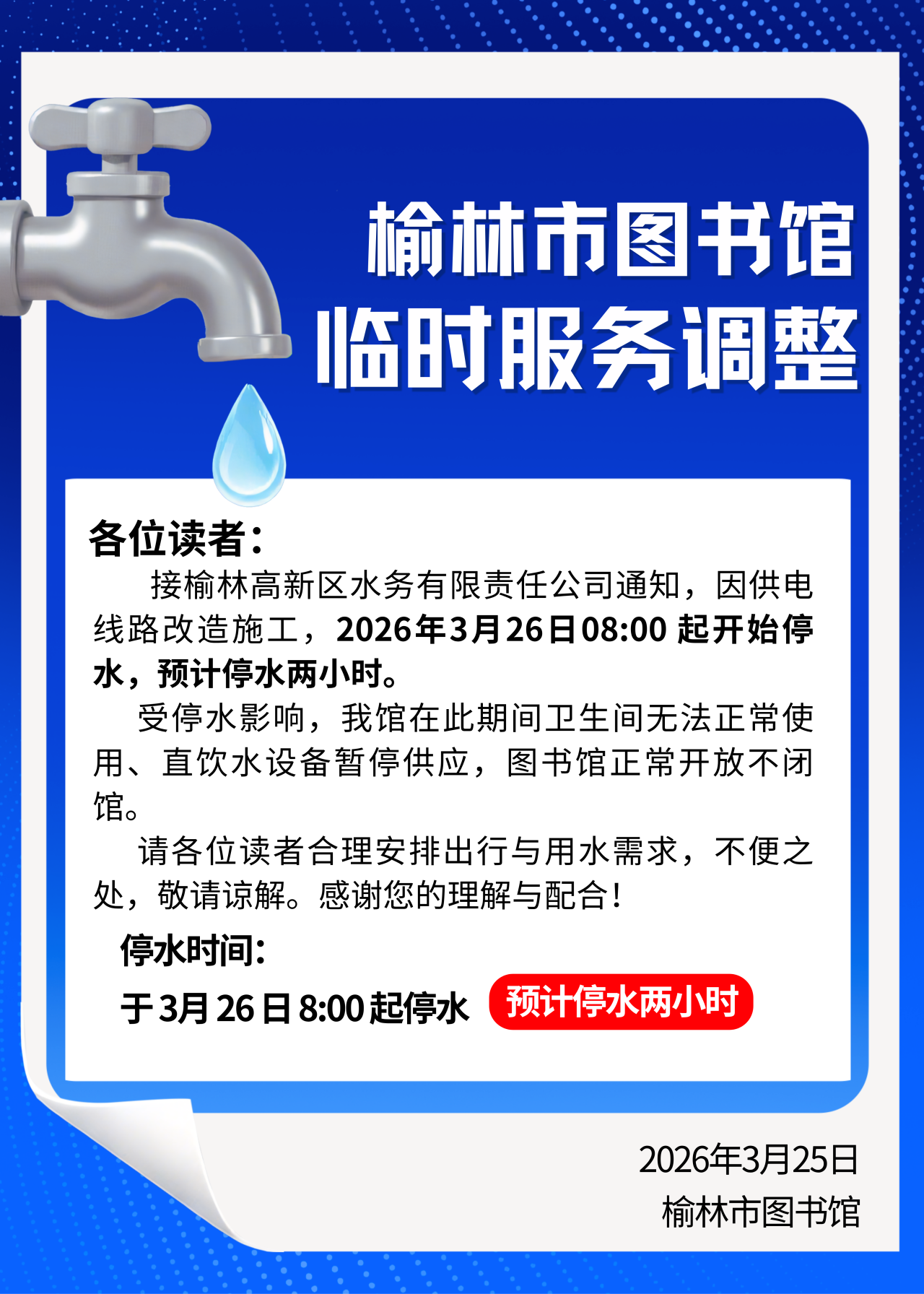 通知|速看!明日上午到馆读者请注意停水安排