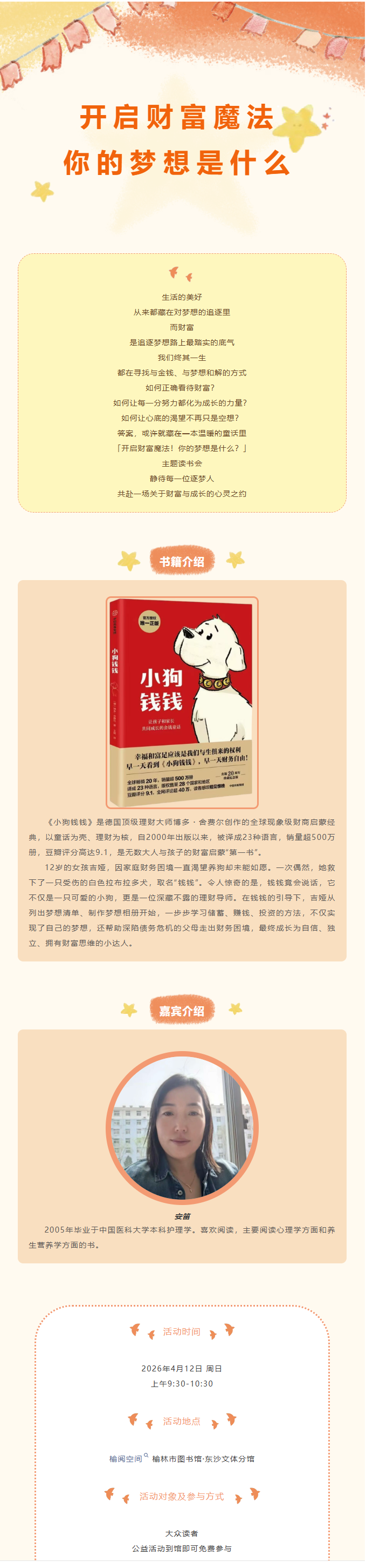 榆阅空间 榆林市图书馆·东沙文体分馆 活动预告 | 《小狗钱钱》系列读书会(第一期)——开启财富魔法